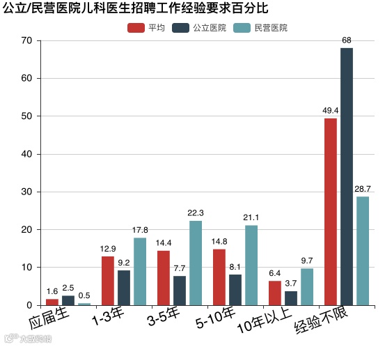 公立医院更多的是经验不限,也说明了公立医院对基层儿科医生需求多这一点。可以看到,民营医院对于经验的需求普遍高于公立医院。综上可知,民营医院更看重工作经验,只要你工作经验足够,哪怕学历和职称低一些都没有关系。