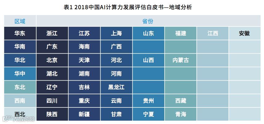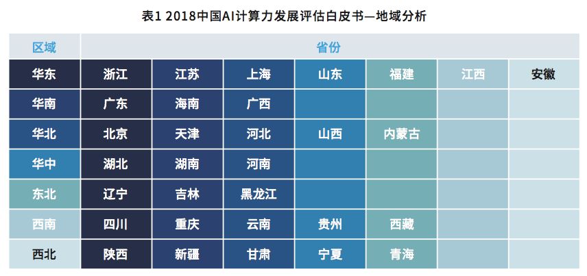 从下表是国内省份的人工智能热图,颜色越深代表计算力投资越热。