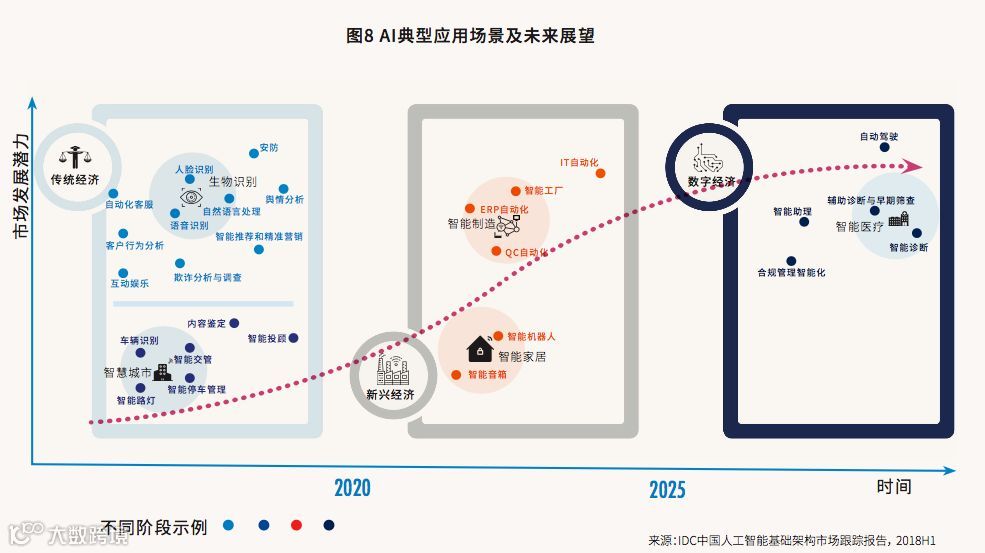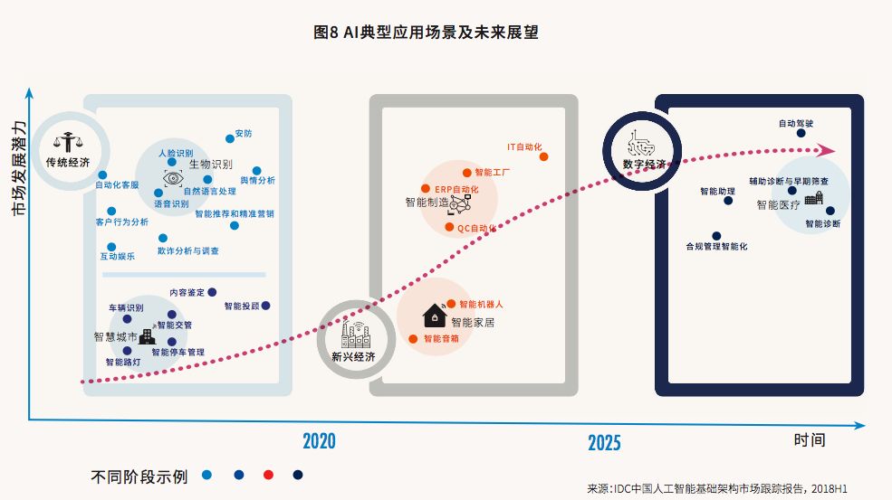 纵轴是市场规模和未来发展潜力的大小,横轴是IDC预测的解决方案成熟和得到广泛应用的时间线。