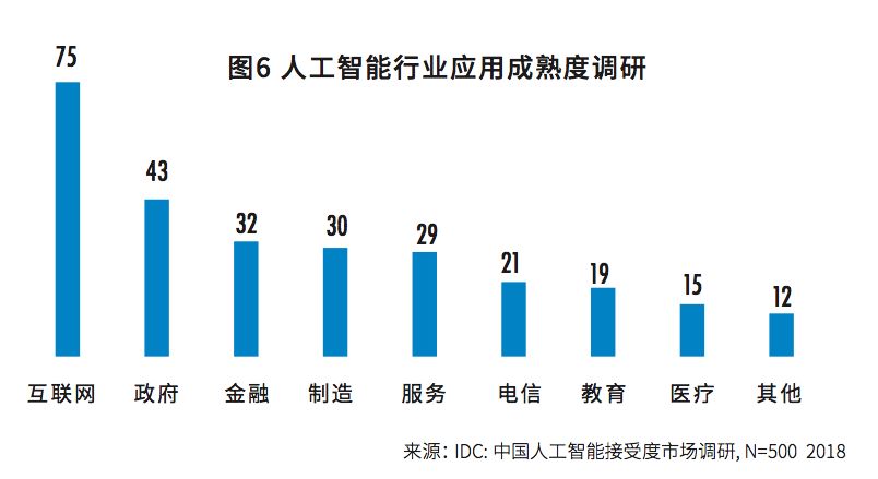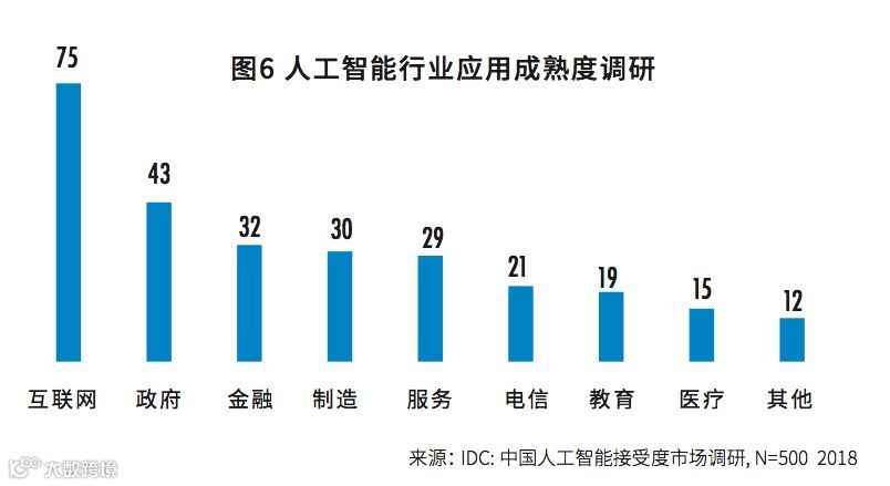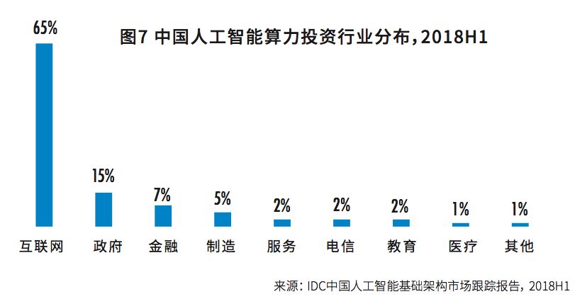 人工智能应用度最高的八个行业中,互联网、政府和金融行业排前三,同时也是人工智能计算力投资最高的三个行业。