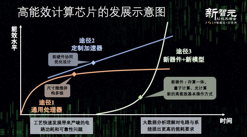 清华大学电子工程系教授汪玉在“2019新智元AI技术峰会——智能云·芯世界”峰会上指出,高能效计算芯片有三种突破路径: