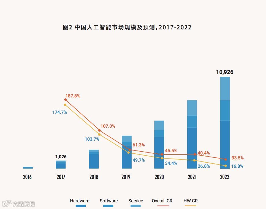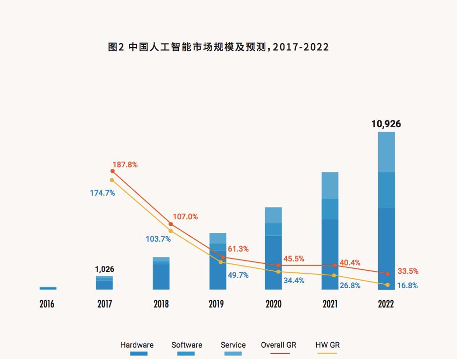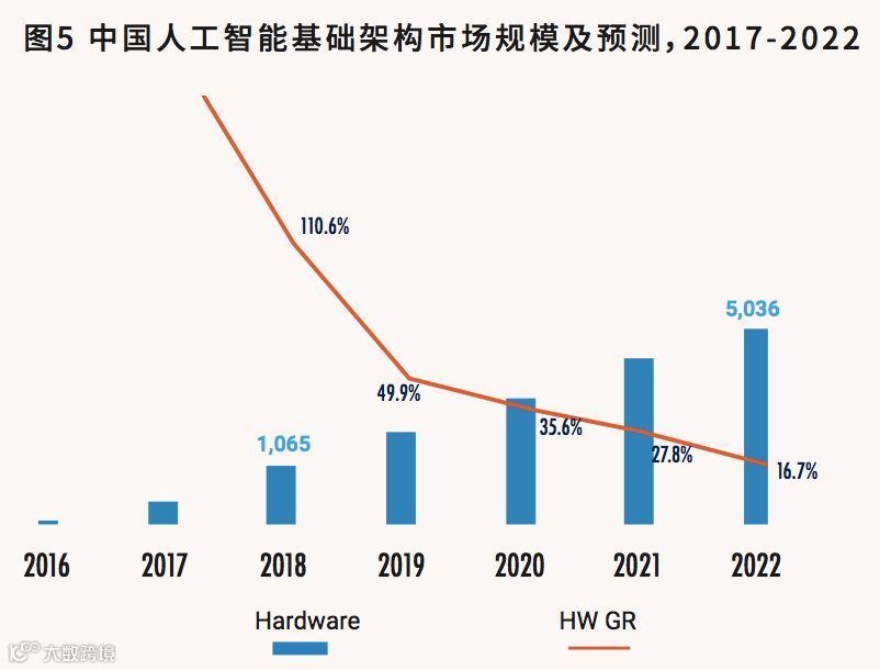 对于中国而言,根据IDC对中国人工智能市场的研究数据,2018年,中国人工智能市场投资规模约25亿美元,其中70%以上为以算力为核心的基础架构硬件市场投资;IDC预测,到2022年,中国的人工智能市场投资规模将超过百亿美元,未来五年的复合增长率超过59%,将形成一个新的千亿人民币规模的产业生态,其中人工智能基础架构硬件市场规模将超过千亿人民币。