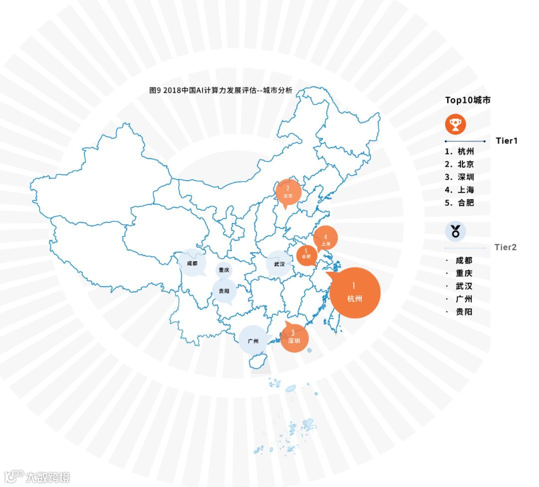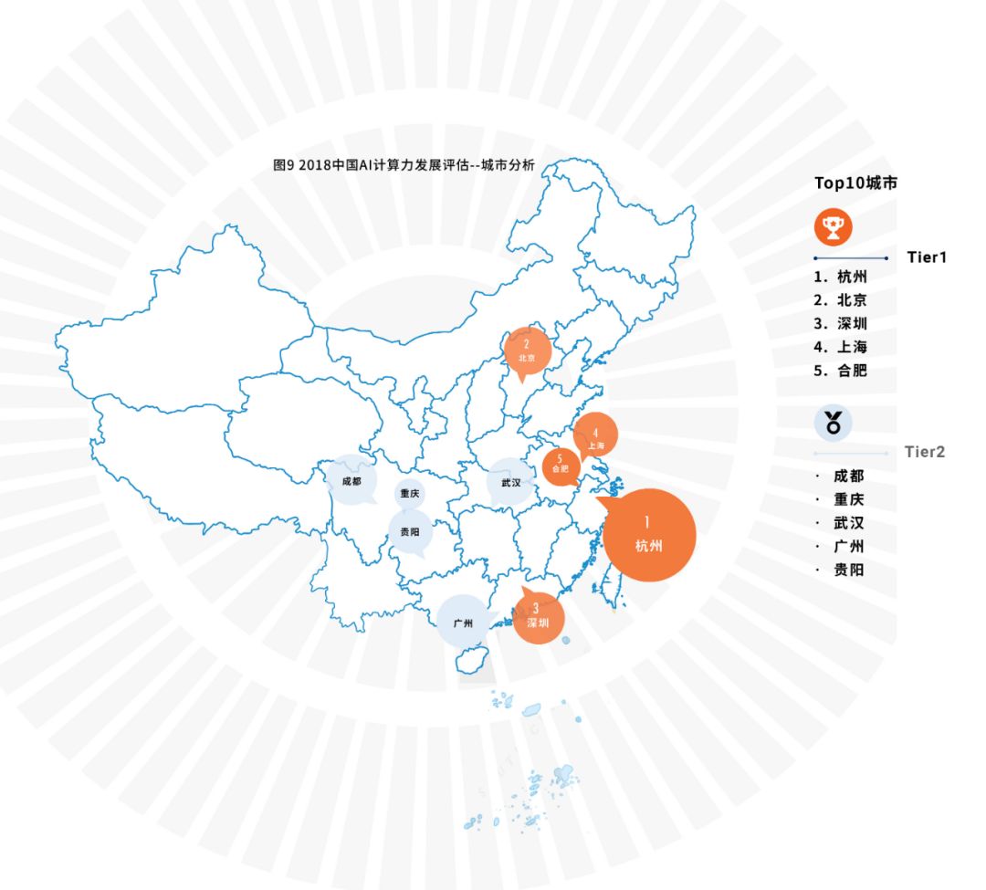 名单有趣的地方在于,互联网公司最聚集的城市——北京仅排第二,计算力不如杭州;合肥这座二线城市也脱颖而出,成为中国最领先的人工智能计算力城市之一。