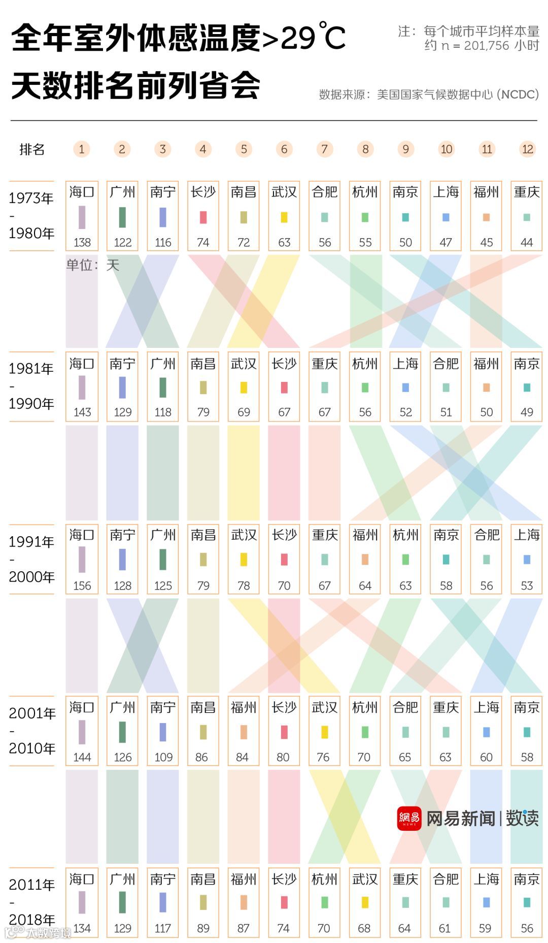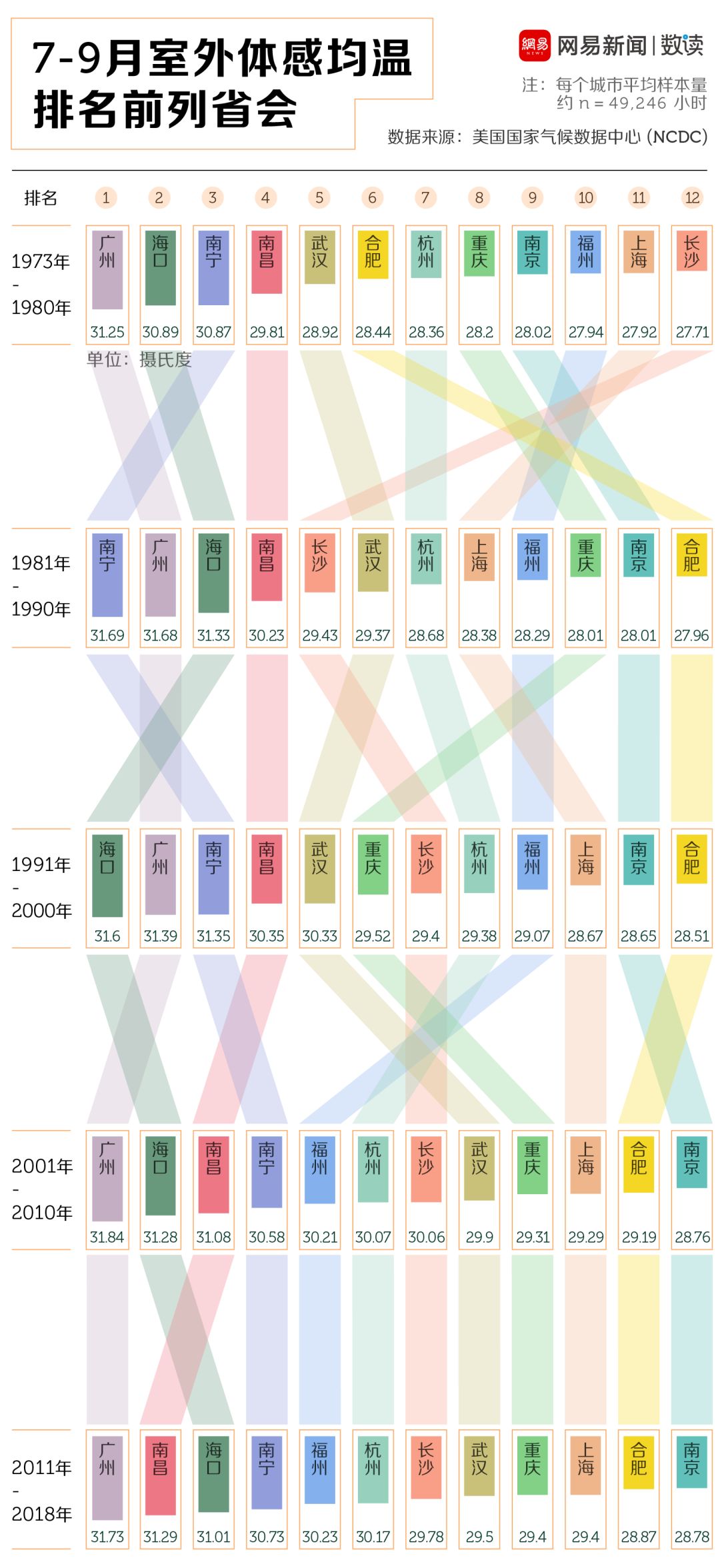 唯一有机会冲击前四的武汉,在1991-2000年间体感均温逼近南昌,达30.33 ℃,不过此后体感均温呈下降趋势,排名渐降。