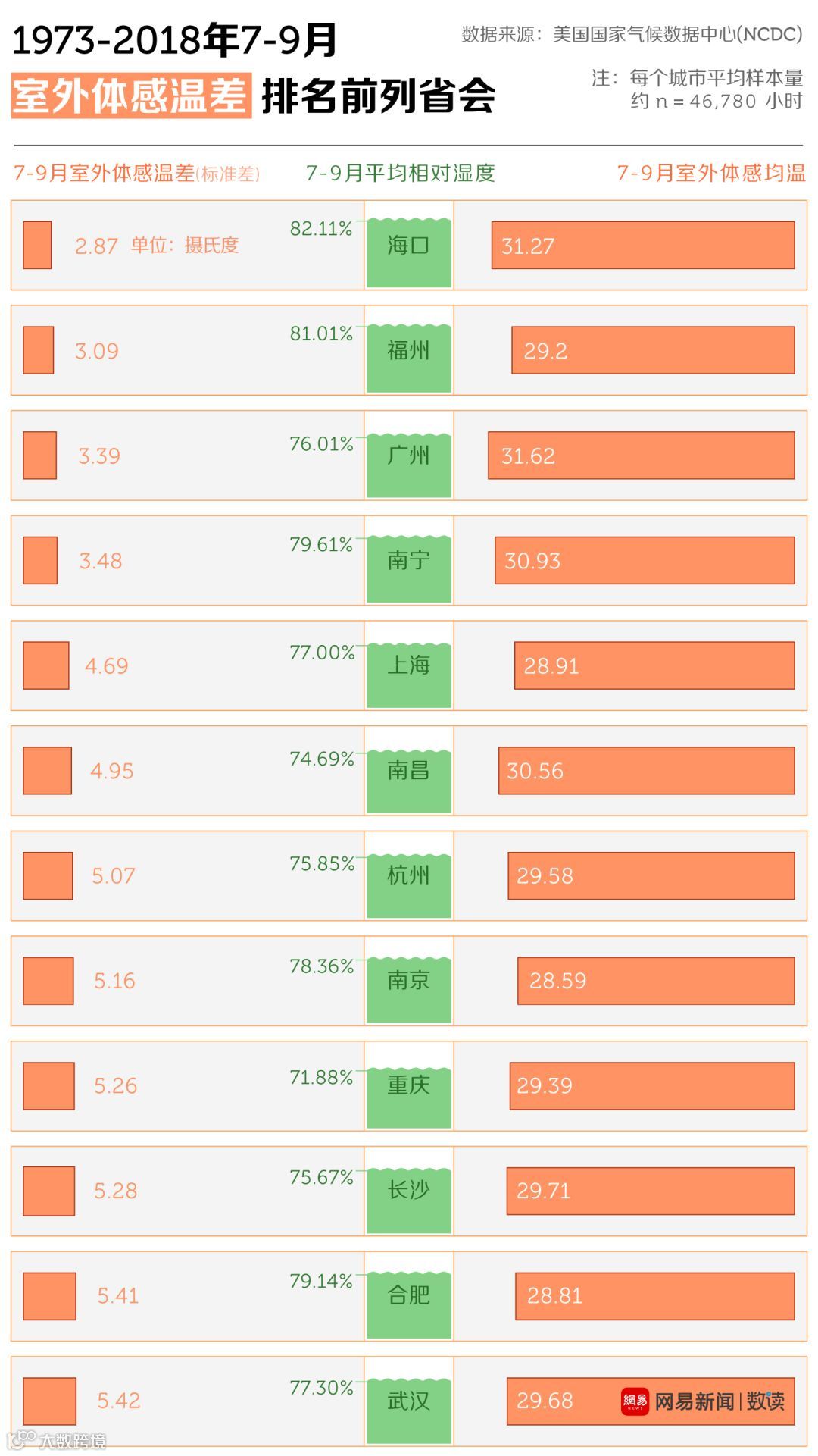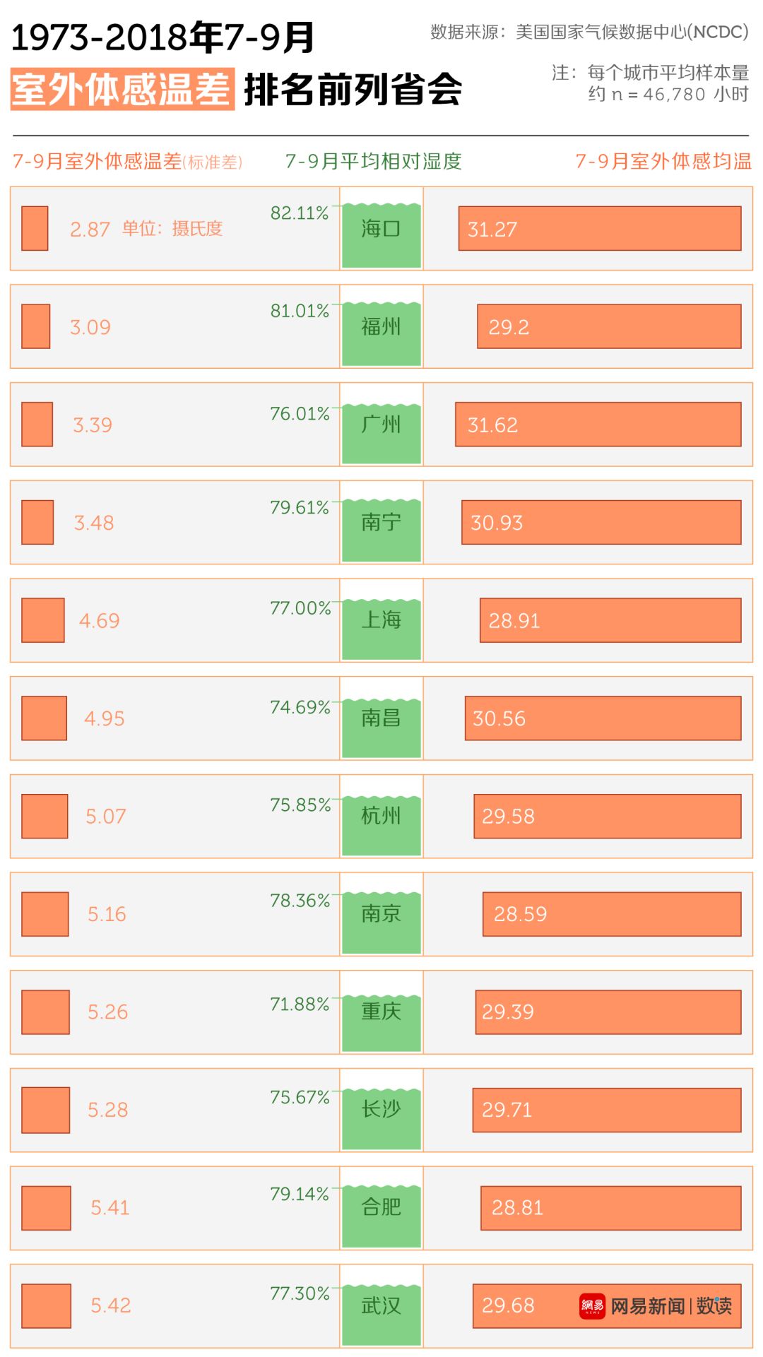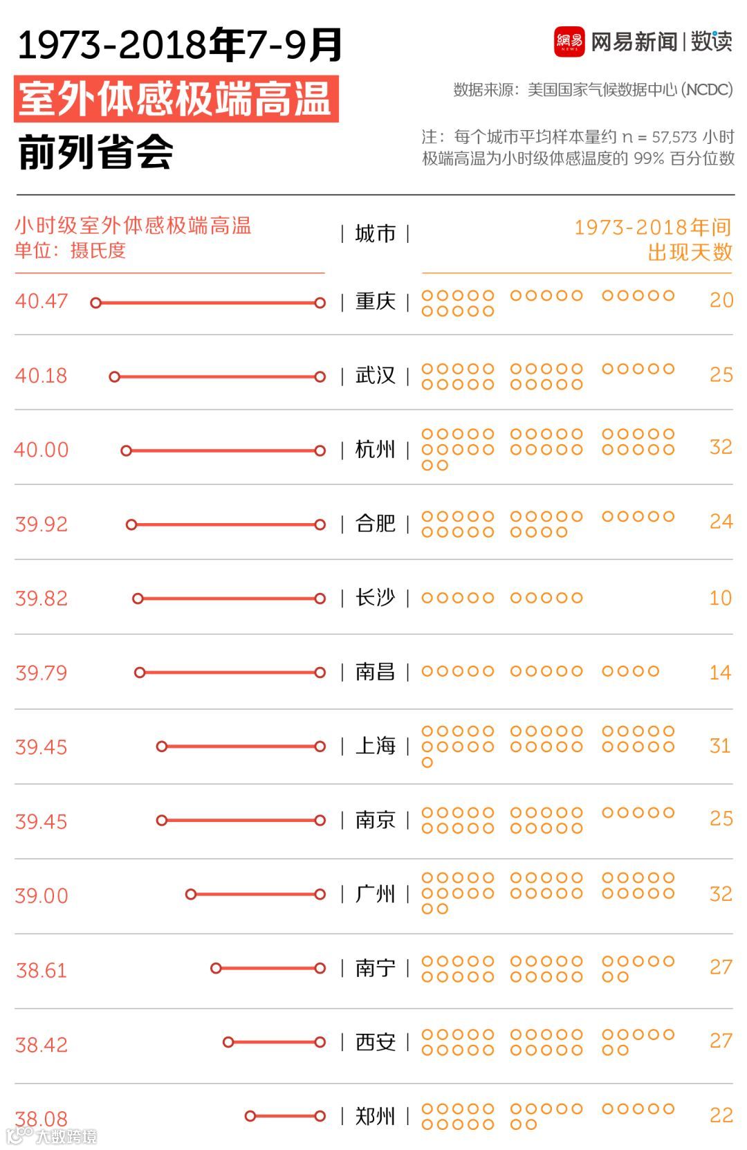 上图呈现了1973-2018年间,7-9月室外体感均温至少1次排名前10的省会城市。
