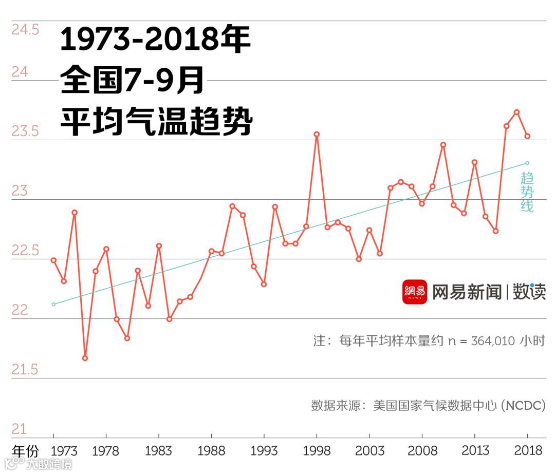 全国范围而言,1973年7-9月的平均气温约22.49 ℃,2018年升至23.53 ℃,平均气温升幅超过1 ℃。