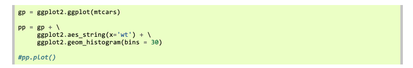 在 Python 中调用 R 语言的优点之一是,我们可以在 Python 中方便地使用 R 语言强大的工具包,如 ggplot2、tidyr、dplyr 等。下面我们通过一个简单的例子来看看如何在 Python 中使用 ggplot2。