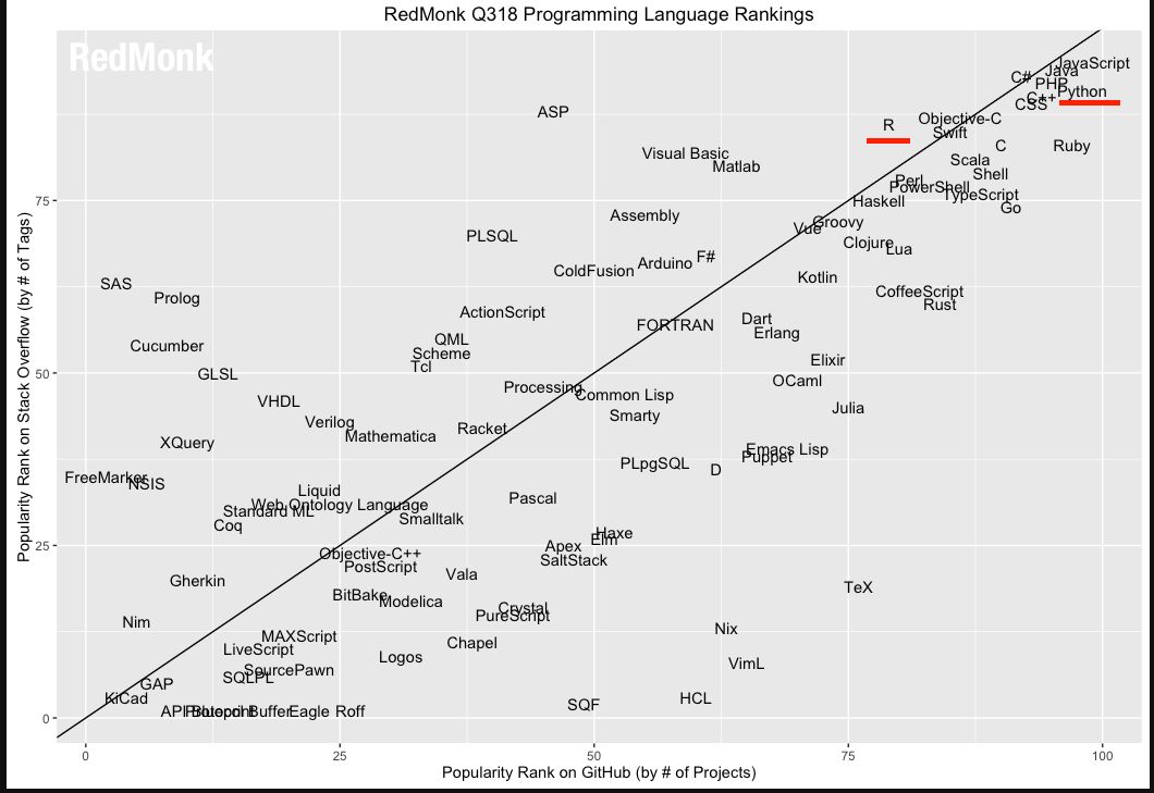 上图显示了由 Red Monk 在 2018 年第三季度所进行的调查的结果。此结果基于 Stack Overflow 和 Github 上语言的受欢迎程度,很明显 R 和 Python 的得分都很高。从语言本身来说,并不是限制我们不能在同一项目中使用两者的原因。而我们的最终目标要做更有洞察、有价值的分析,而选择哪种语言不应该成为这一过程中的阻碍。