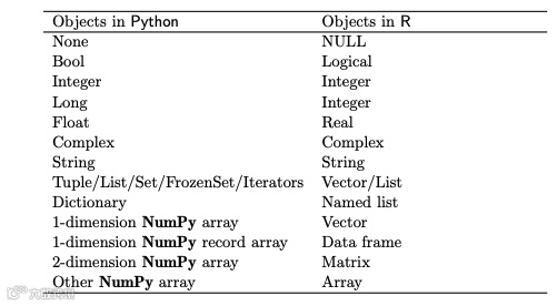 提供 R 对象和 Python 对象间的相互转换(例如,R 与 Pandas 数据框的转换,或 R 矩阵与 NumPy 数组的转换)。
