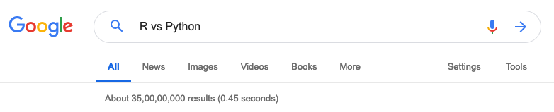 如果你在 Google 中搜索“R vs Python”,可以看到很多关于二者谁更好的讨论。