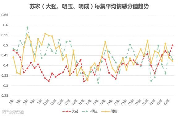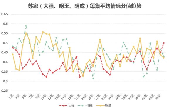 打分筛选过后,我们统计出每一集苏家每个人的平均情感分值,并绘制出曲线图(4 个人导致折线图可读性较差,所以只有委屈大哥了):
