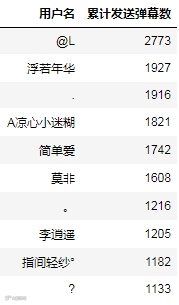 为此,我们筛选出累计发送弹幕 Top10 的用户: