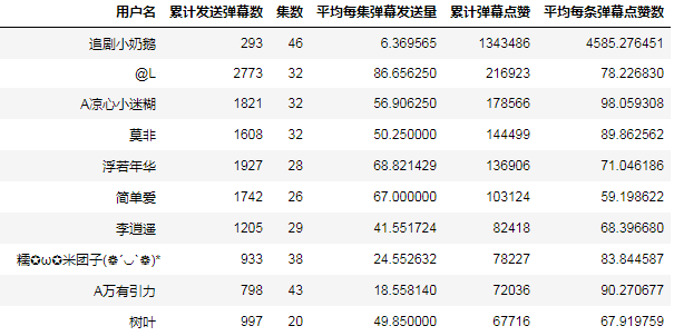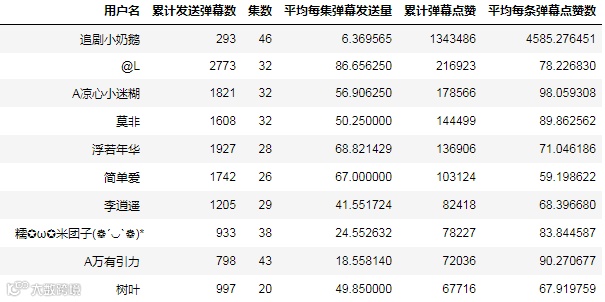 第一名“追剧小奶鹅”平均每集发 6 条弹幕,每条弹幕竟然能够得到 4585 个赞!难道这就是传说中的精神领袖吗?难道大佬之外还有大佬吗?