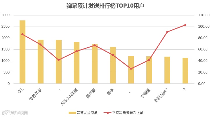 一位名叫“@L”的用户独占鳌头,是毋庸置疑的 C 位输出。在 46 集的电视剧中,他的弹幕血洗了 32 集,累计发射 2773 条弹幕,平均每集发送 86.66 条。