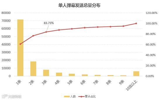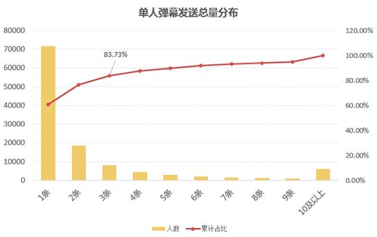 显而易见,大部分用户还是比较佛系的,71607 位用户(占比 60.95%)在 46 集中只发送过 1 条弹幕,他们内心严格遵循“爱就一个字,我只发一次”的弹幕发送准则。