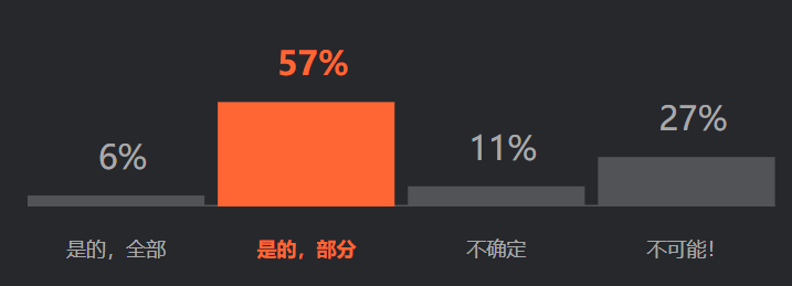 据调查显示,57% 的受访者感受到了危险,并认为未来有一天 AI 会取代开发者的位置。不过也有 27% 认为 AI 绝不可能取代开发人员。