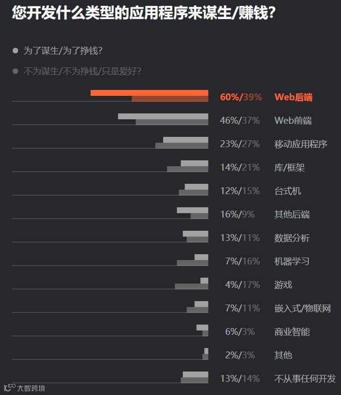 根据《2019 开发人员生态系统现状》报告显示,Web 后端在程序员岗位中最受欢迎,有 60% 的受访者称选择 Web 后端以谋生,其中 39% 的 Web 后端开发者表示兴趣使然选择了该职位。