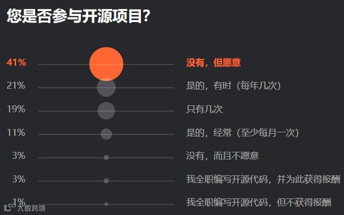 在各大科技公司纷纷拥抱开源之际,事实上,很多开发者因工作、时间、后期维护等因素并不能完全拥抱开源。对此,仅有 21% 的受访者表示每年会有几次参与开源项目。
