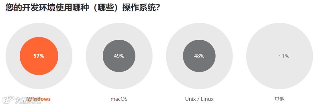 因微软战略的改变,Windows 已从软件之列成为用户的一种服务。不过,大多数开发者的开发环境还是建立于 Windows 操作系统之上,其次 49% 的用户使用 macOS,48% 的受访者使用 Unix 或 Linux。整体而言,这三种操作系统的使用率相差并不大。