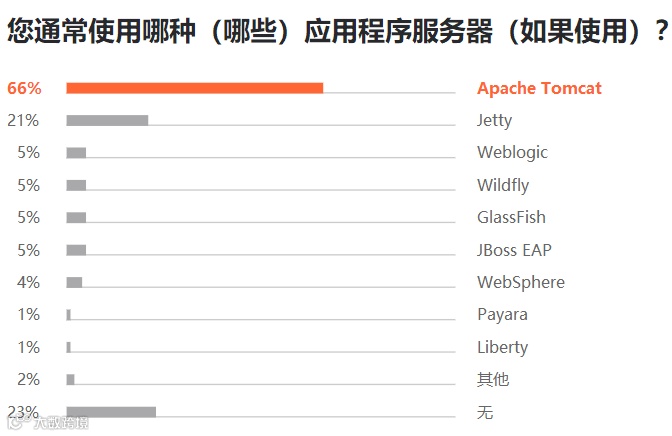 对于不用应用服务器的程序员而言,有 61% 的受访者表示会选用 Spring Boot 框架。与此同时,Spring Boot 也是最流行的 Java Web 框架,相较去年,其使用率增长了 14%。