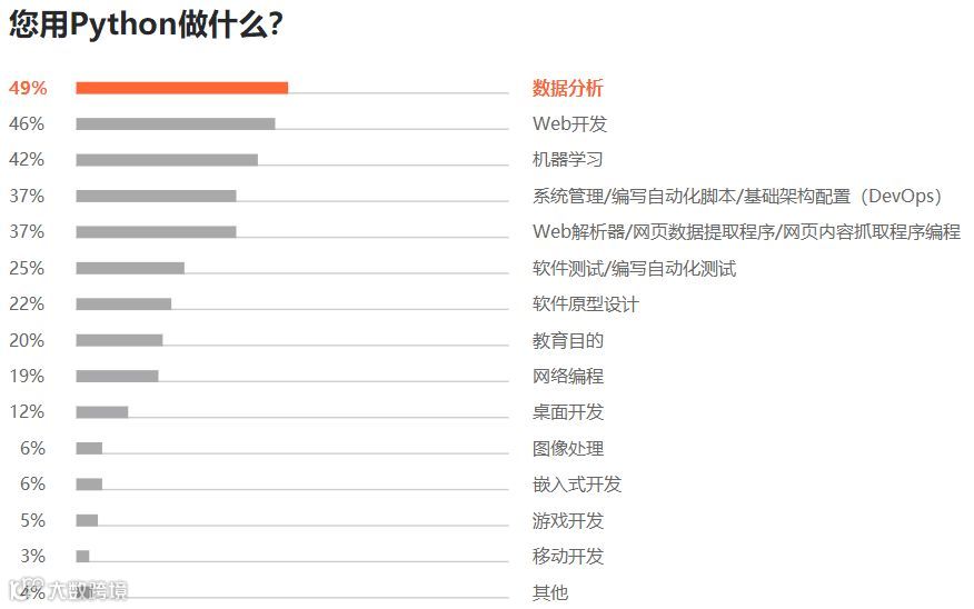 据报告显示,49% 的开发者使用 Python 做数据分析,其次,46% 的受访者将其用于 Web 开发,还有 42% 的人用于机器学习方面。