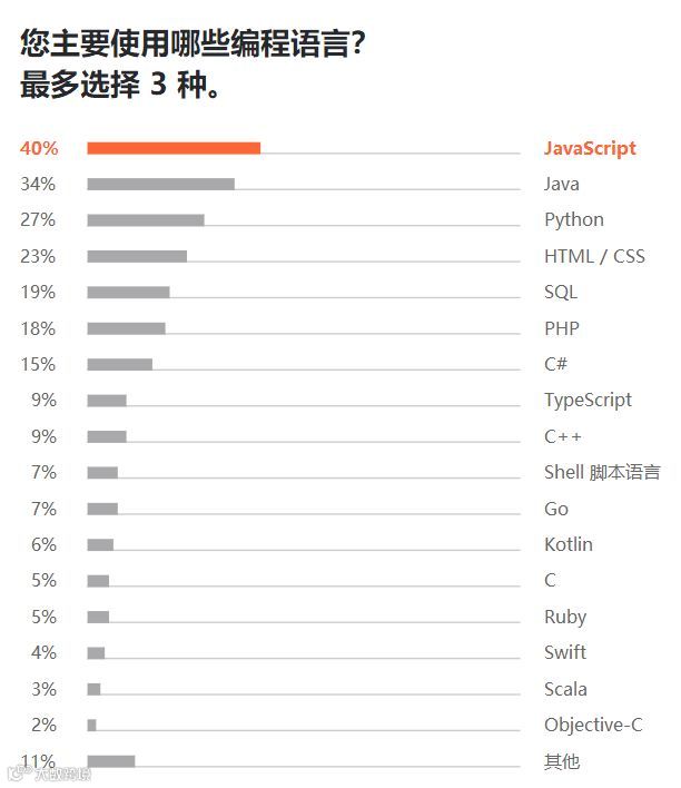 从另一方面而言,Java 是独占鳌头的语言。其用户中有 44% 只使用或首先使用 Java。其后是 JavaScript,份额“仅有” 17%。