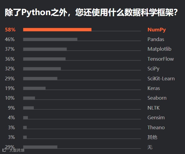 而除了 Python 之外,58% 的受访者称还会使用 Numpy 数据科技框架。