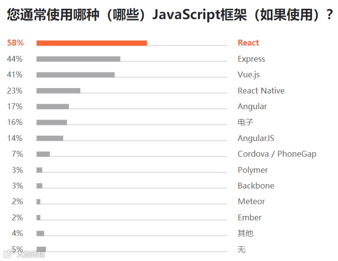 在 JavaScript 语言中,JetBrains 还针对常用的框架做了调查。根据报告显示,React 是业界流传的前端主流三大框架 React、Vue.js、Angular 中使用率最高的,占比高达 58%。同时,JetBrains 也表示,Vue.js 的流行度正逐年增长,自去年以来,份额已经占到 11%,几乎是 2017 年的一倍。在本次受访者中,也有 41% 的开发者表示主要使用 Vue.js 框架。