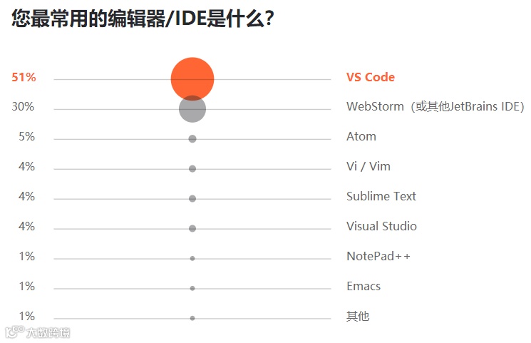 对于编辑器的选择,使用 JavaScript 的开发者中有 51% 的受访者称常用的 IDE 为 VS Code。