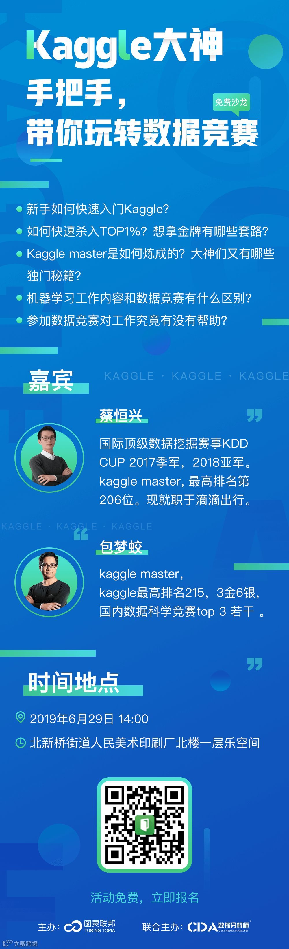由图灵联邦与CDA数据分析师联合主办的《Kaggle大神手把手,教你玩转数据分析》线下沙龙将于6月29日(周六)在北京举办,活动免费!