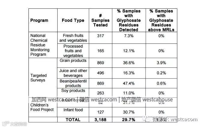 以下是CFIA在测试食品草甘膦残留物的发现,并根据加拿大卫生部制定的最大残留限量(MRL)进行测量。