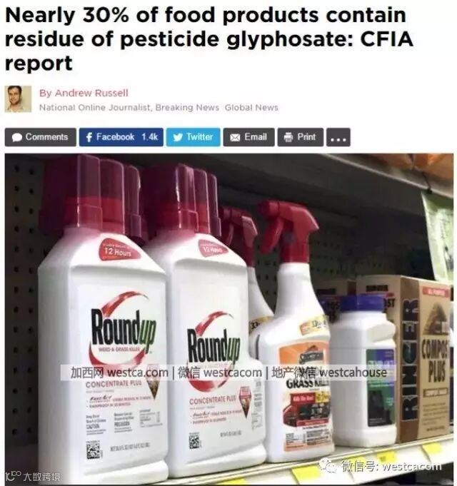 加拿大食品检验局表示,已经在大约30%的食品中发现了人们生活大量广泛使用和有争议的除草剂,其残留量超过了粮食产品的建议的4%限值。