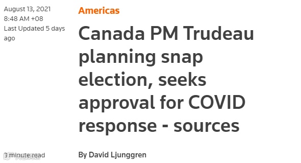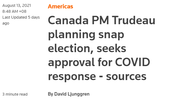Trudeau认为,高疫苗接种率和疫情后的经济反弹将有助于他延长和加强对权力的控制。