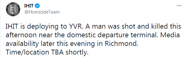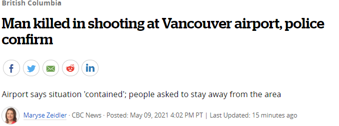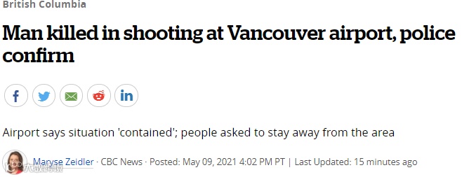 据了解,该起枪击案发生在今天(9日 )下午3点至3点半之间,温哥华国际机场在事发后立即关闭。