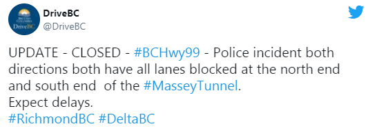同一时间,警方下令封锁了所有通往列治文的主要路段,包括Arthur Laing桥、Knight桥、Oak St桥、Queensborough桥和Massey隧道。