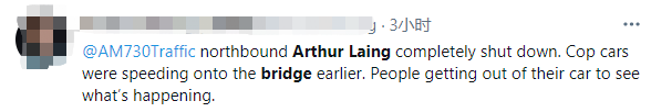 "Arthur Laing桥完全被封了,好多人下车张望想看看到底是怎么回事?"