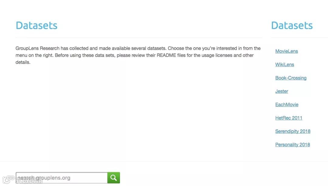 Group Lens 上有几个可用的数据集,这些数据集对特定的项目很有用。一些数据集已有十多年的历史。你可以在这里得到很多关于书籍和电影的信息。