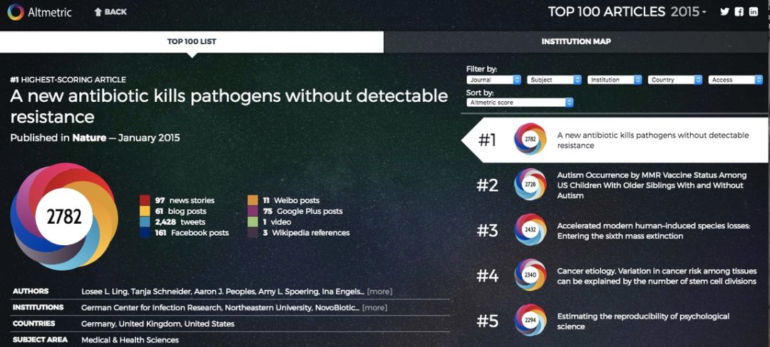 Altmetric 有些数据是需要付费的,但它们还提供每年发布的最具热度的前 100 篇文章,这非常有用。