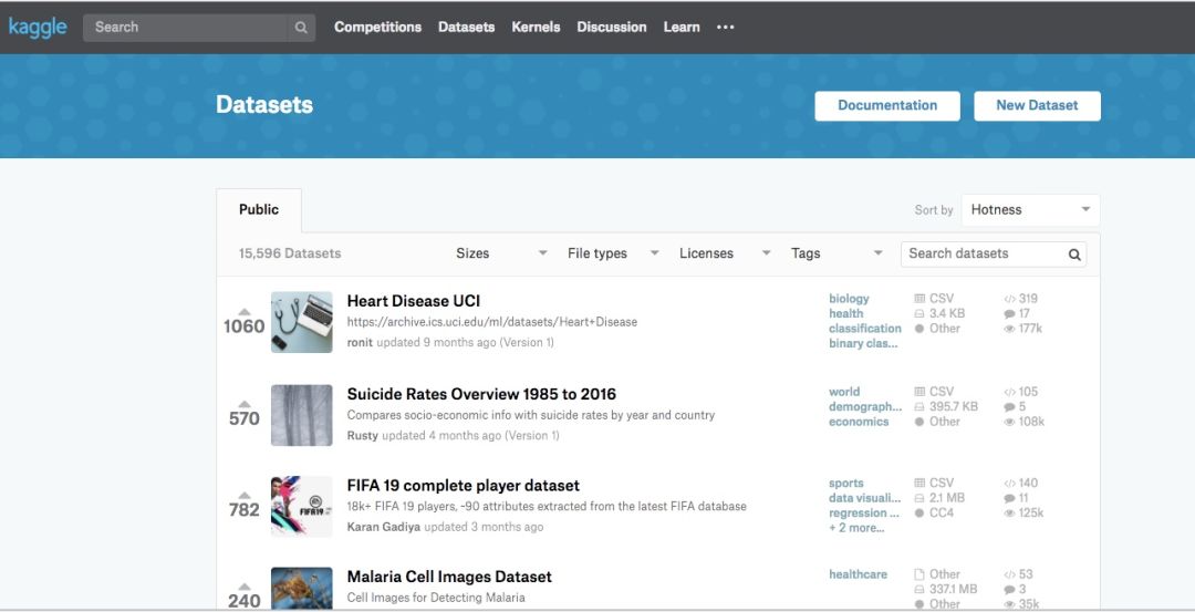 Kaggle 目前有将近 16,000 个数据集。你可以找到从运动队球员统计到洛杉矶停车引语任何范畴的数据。