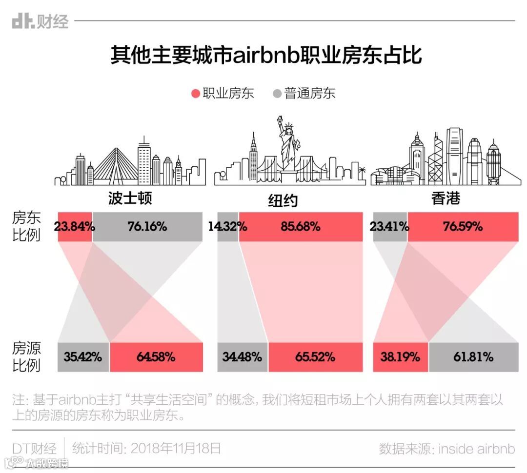 这里要强调的是,北京并不是个例。DT君还顺手查看了下全球其他主要城市的数据,发现在波士顿和香港的Airbnb,都出现了大部分房源来自于职业房东的情况。
