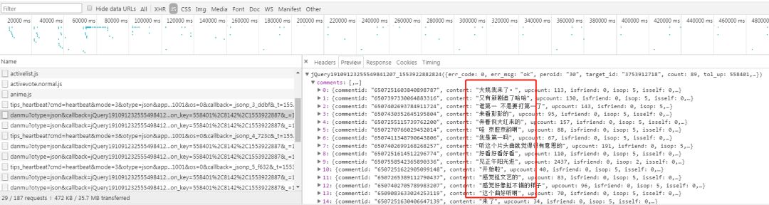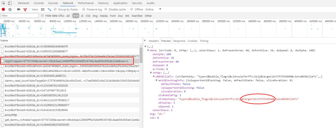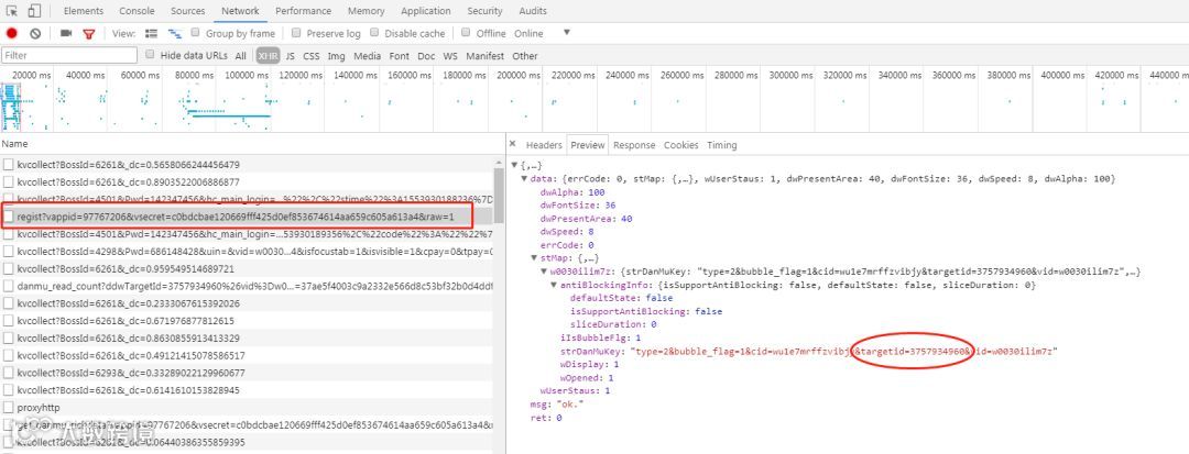 正片开始后,一群以“danmu"为开头的请求不断加载打破了短暂的平静,我们把这个疑似目标预览一下: