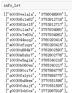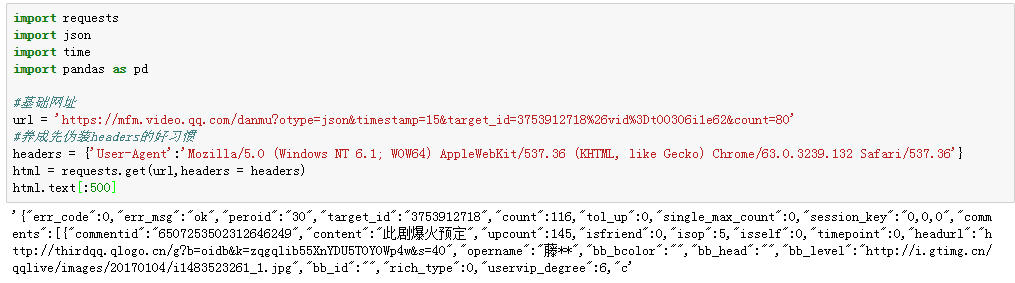#定义爬取单集target_id的函数#只需要向函数传入v_id(后缀ID)和headersdef get_episode_danmu(v_id,headers):#target_id所在基础网址base_url = 'https://access.video.qq.com/danmu_manage/regist?vappid=97767206&vsecret=c0bdcbae120669fff425d0ef853674614aa659c605a613a4&raw=1'#传递参数,只需要改变后缀IDpay = {"wRegistType":2,"vecIdList":[v_id],"wSpeSource":0,"bIsGetUserCfg":1,"mapExtData":{v_id:{"strCid":"wu1e7mrffzvibjy","strLid":""}}}html = requests.post(base_url,data = json.dumps(pay),headers = headers)bs = json.loads(html.text)#定位元素danmu_key = bs['data']['stMap'][v_id]['strDanMuKey']#解析出target_idtarget_id = danmu_key[danmu_key.find('targetid') + 9 : danmu_key.find('vid') - 1]return [v_id,target_id]info_lst = []#循环获取后缀ID并传递for i in base_info['id']:#得到每一集的后缀ID和target_idinfo = get_episode_danmu(i,headers)print(info)info_lst.append(info)time.sleep(3 + random.random())