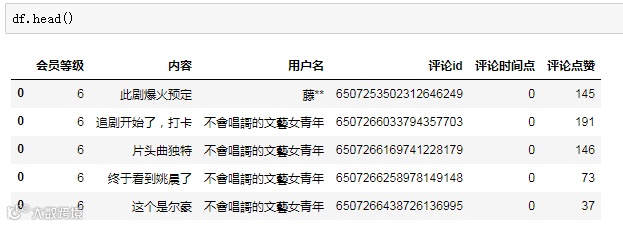 #存储数据df = pd.DataFrame()#遍历获取目标字段for i in bs['comments']:content = i['content'] #弹幕内容name = i['opername'] #用户名upcount = i['upcount'] #点赞数user_degree =i['uservip_degree'] #会员等级timepoint = i['timepoint'] #发布时间comment_id = i['commentid'] #弹幕IDcache = pd.DataFrame({'用户名':[name],'内容':[content],'会员等级':[user_degree],'评论时间点':[timepoint],'评论点赞':[upcount],'评论id':[comment_id]})df = pd.concat([df,cache])