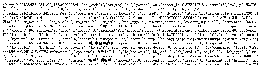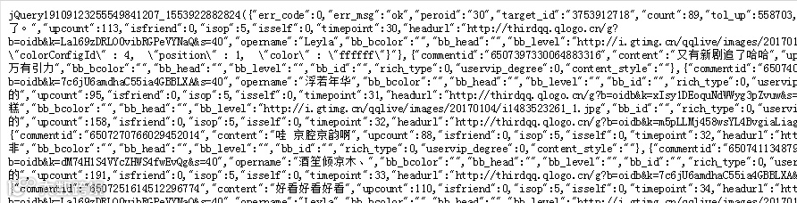 https://mfm.video.qq.com/danmu?otype=json&callback=jQuery19109123255549841207_1553922882824×tamp=45&target_id=3753912718%26vid%3Dt00306i1e62&count=80&second_count=5&session_key=558401%2C8142%2C1553922887&_=1553922882831