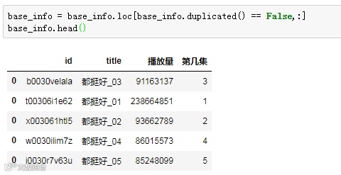 part1_url = 'https://union.video.qq.com/fcgi-bin/data?otype=json&tid=682&appid=20001238&appkey=6c03bbe9658448a4&idlist=b0030velala,t00306i1e62,x003061htl5,b0030velala,w0030ilim7z,i0030r7v63u,z003044noq2,m0030sfinyr,c0030u884k7,k0030m5zbr7,l0030e5nglm,h0030b060vn,j003090ci7w,n0030falyoi,s00308u9kwx,p0030fohijf,g00303ob0cx,v0030960y6n,x0030bl84xw,v0030keuav1,t0030kups1i,n0030y2o52i,x0030s52mev,d0030xuekgw,o0030md1a2a,x0030peo3sk,d00303l5j4k,t0030aexmnt,a0030ybi45z,y0030wpe2wu&callback=jQuery19101240739643414368_1553238198070&_=1553238198071'part2_url = 'https://union.video.qq.com/fcgi-bin/data?otype=json&tid=682&appid=20001238&appkey=6c03bbe9658448a4&idlist=t0030epjqsi,g003035mi84,n00301fxqbh,h0030zivlrq,d0030qc1yu2,m0030q9ywxj,h0030j0eq19,j0030jks835,t0030owh5uu,e0030xbj246,a00308xw434,l0030tb319m,a0030mhntt6,t0030wnr3t9,l0030t7o64e,b0030i9bi3o,m0030yklk6j,z0030tgz3pp,r00307wgnly,o00306b4zax,k00309i6ul6,j00304eu73n,v08521l667a,u0851gzzoqi,a0852328197,k0852mb3ymt,v00308p65xf,z08527pia6g,z08520difig,z0852ybpxn0&callback=jQuery19101240739643414368_1553238198072&_=1553238198073'base_info = pd.DataFrame()for url in [part1_url,part2_url]:html = requests.get(url,headers = headers)bs = json.loads(html.text[html.text.find('{'):-1])for i in bs['results']:v_id = i['id']title = i['fields']['title']view_count = i['fields']['view_all_count']episode = int(i['fields']['episode'])if episode == 0:passelse:cache = pd.DataFrame({'id':[v_id],'title':[title],'播放量':[view_count],'第几集':[episode]})base_info = pd.concat([base_info,cache])