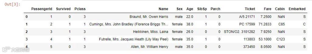 探索数据是第一步。你需要从 Kaggle 的 Titanic 页面下载数据,然后将下载的数据放到你启动 Jupyter 笔记本的文件夹中。