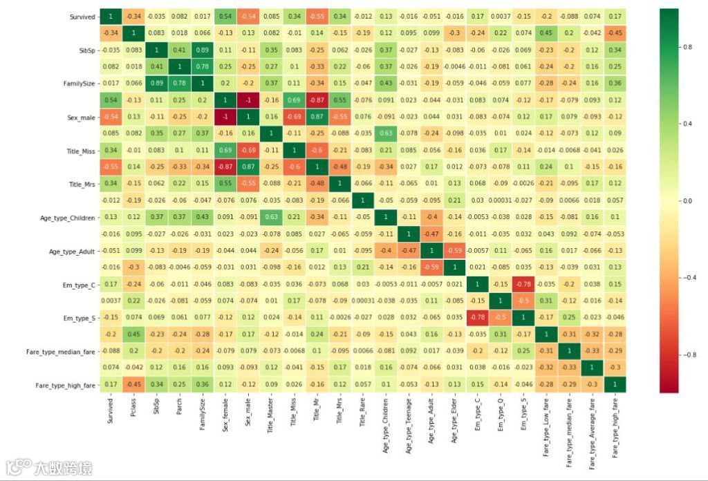相关值接近 1 意味着高度正相关,-1 意味着高度负相关。例如,性别为男和性别为女之间就呈负相关,因为必须将乘客识别为一种性别(或另一种)。此外,你还可以看到,除了用特征工程创建的内容外,没有哪两种是高度相关的。这证明我们做得对。