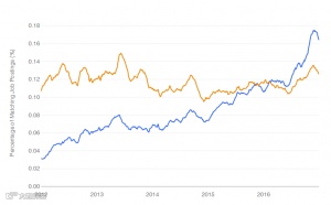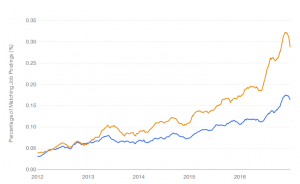 在全球范围内,SAS仍然是市场领导者,大多数大型组织仍然在SAS上工作。另一方面,R/Python对于初创企业和寻求成本效益的公司来说是更好的选择。此外,据报告,在过去几年里,R/Python相关的工作数量有所增加。这是一个在互联网上广泛发布的趋势,显示了R和SAS工作数量的趋势。用于数据分析的Python工作与R工作具有类似或更高的趋势: