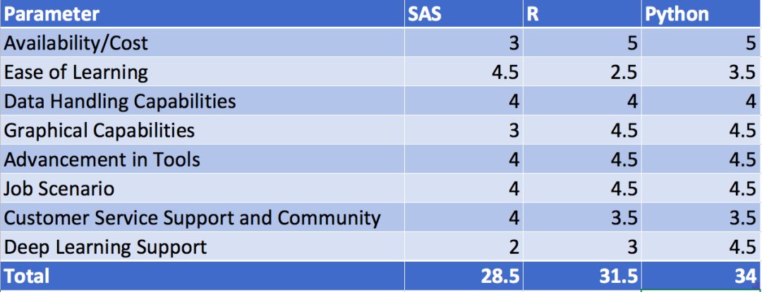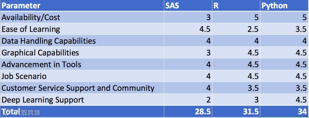 关于三种数据科学工具Python、R和SAS,本文从8个角度进行比较分析并在文末提供记分卡,以便你随时调整权重,快速做出选择。
