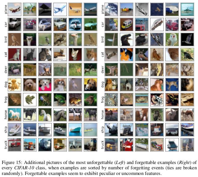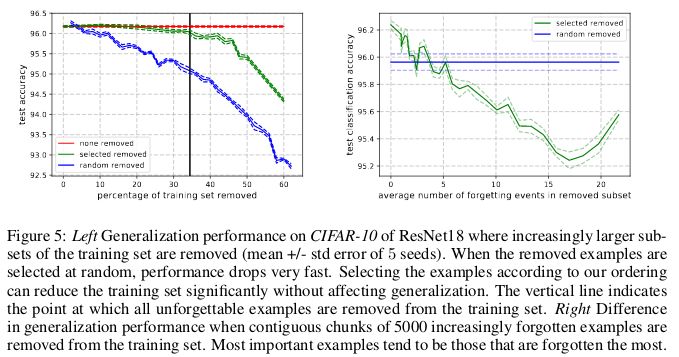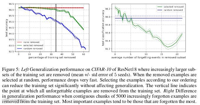 在 ICLR 2019 的一篇论文 An Empirical Study of Example Forgetting During Deep Neural Network Learning 中,研究者们表示在多个常见的较小图像数据集中,存在显著冗余。令人震惊的是,在 CIFAR-10 中,我们可以在不显著影响测试集准确率的情况下剔除 30% 的数据点。